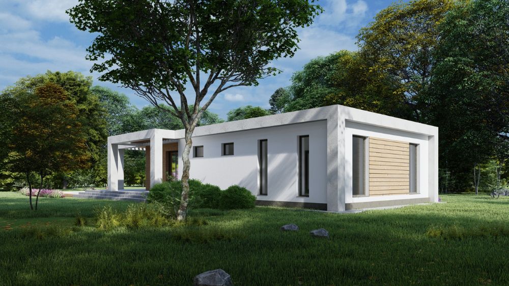 Lenyűgöző, lapostetős családi ház, ahol a kő és a fa elemek összhangja varázsol harmonikus, idilli atmoszférát. Ezt egészíti ki a tágas belső tér és a több szoba, köztük egy külön dolgozószoba, amely még teljesebbé teszi az otthon élményét.