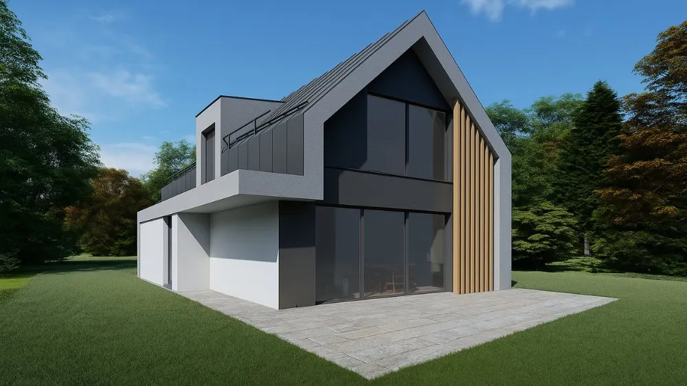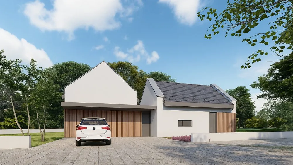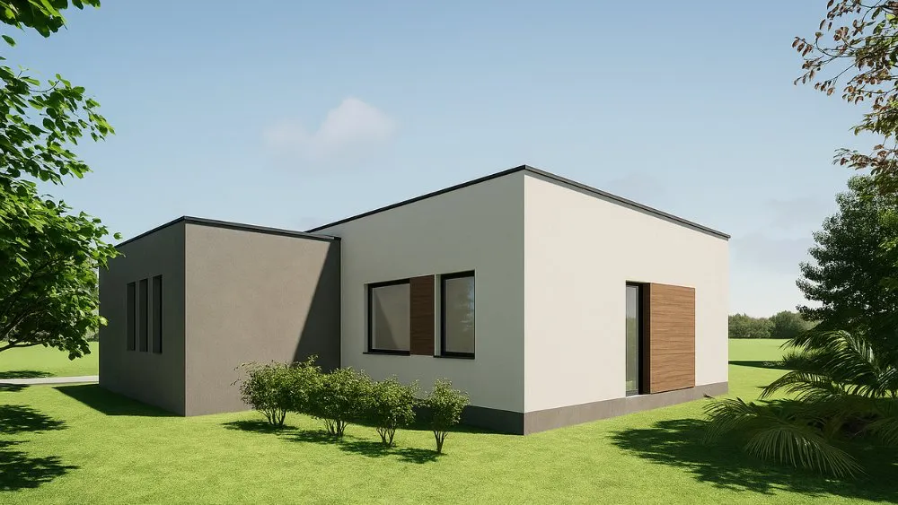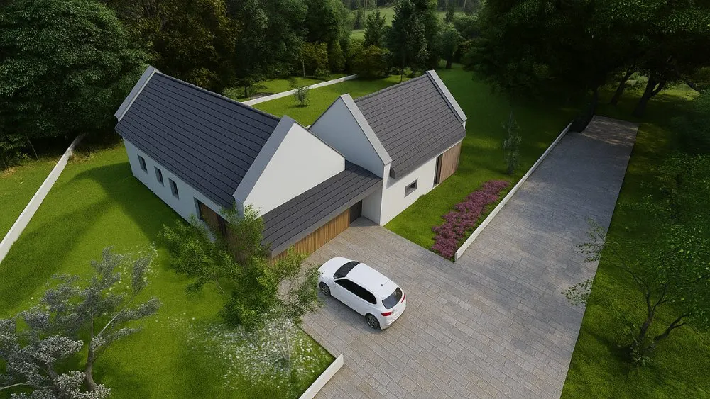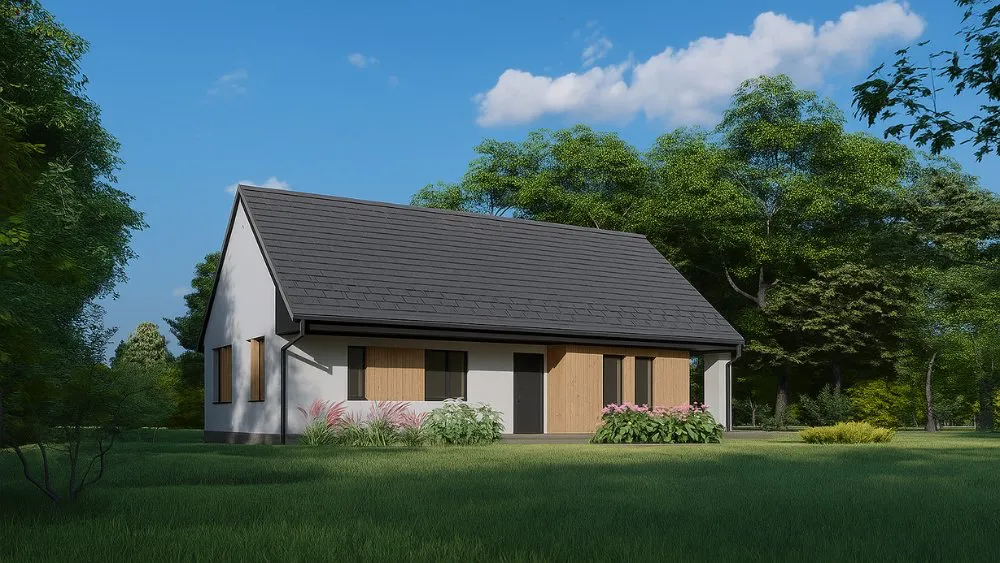 Ha valaki a szokványostól eltérő kialakítást részesíti előnyben, ez az „L” alakú családi ház remek választás lehet. Több szobájával kényelmes otthont biztosít közepes és nagyobb családok számára egyaránt.