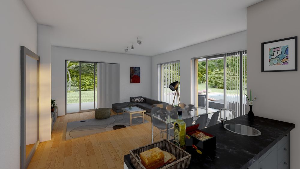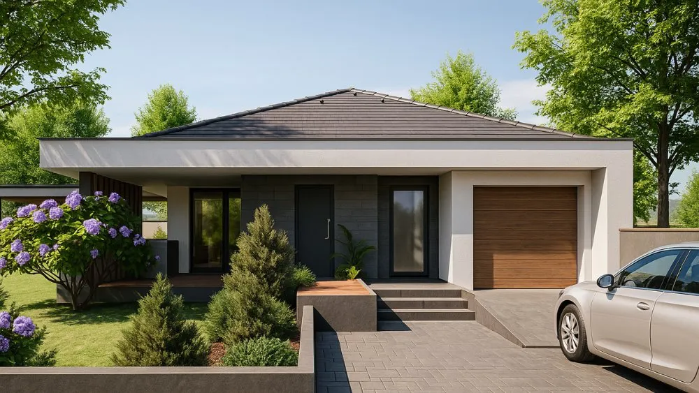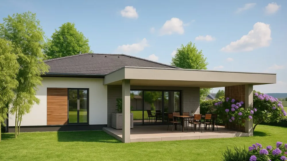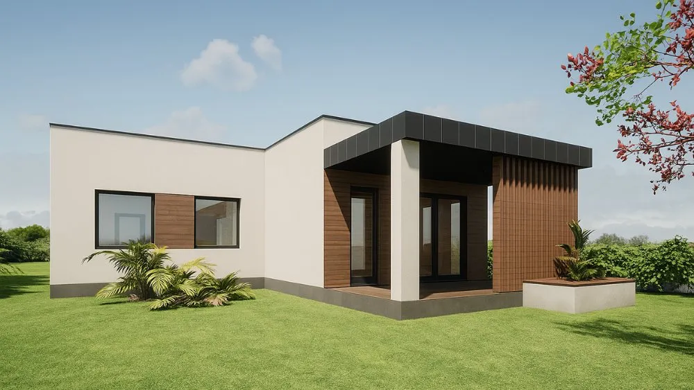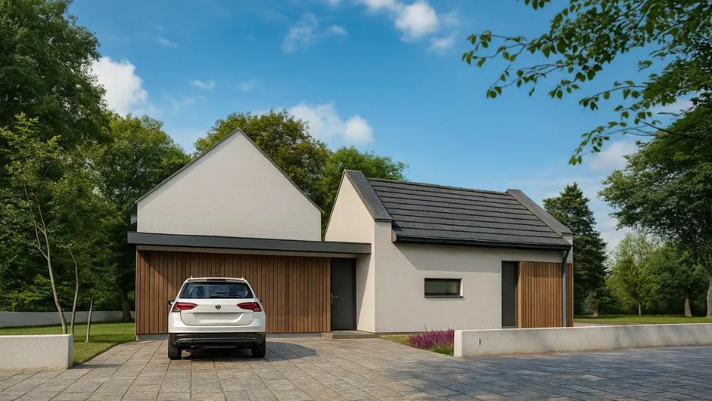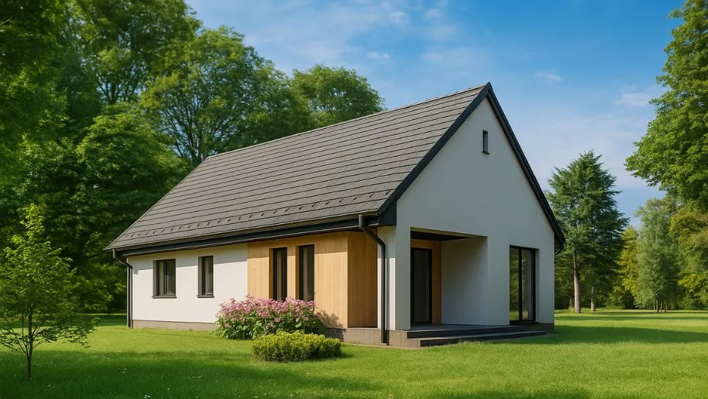 Ha valaki a szokványostól eltérő kialakítást részesíti előnyben, ez az „L” alakú családi ház remek választás lehet. Több szobájával kényelmes otthont biztosít közepes és nagyobb családok számára egyaránt.